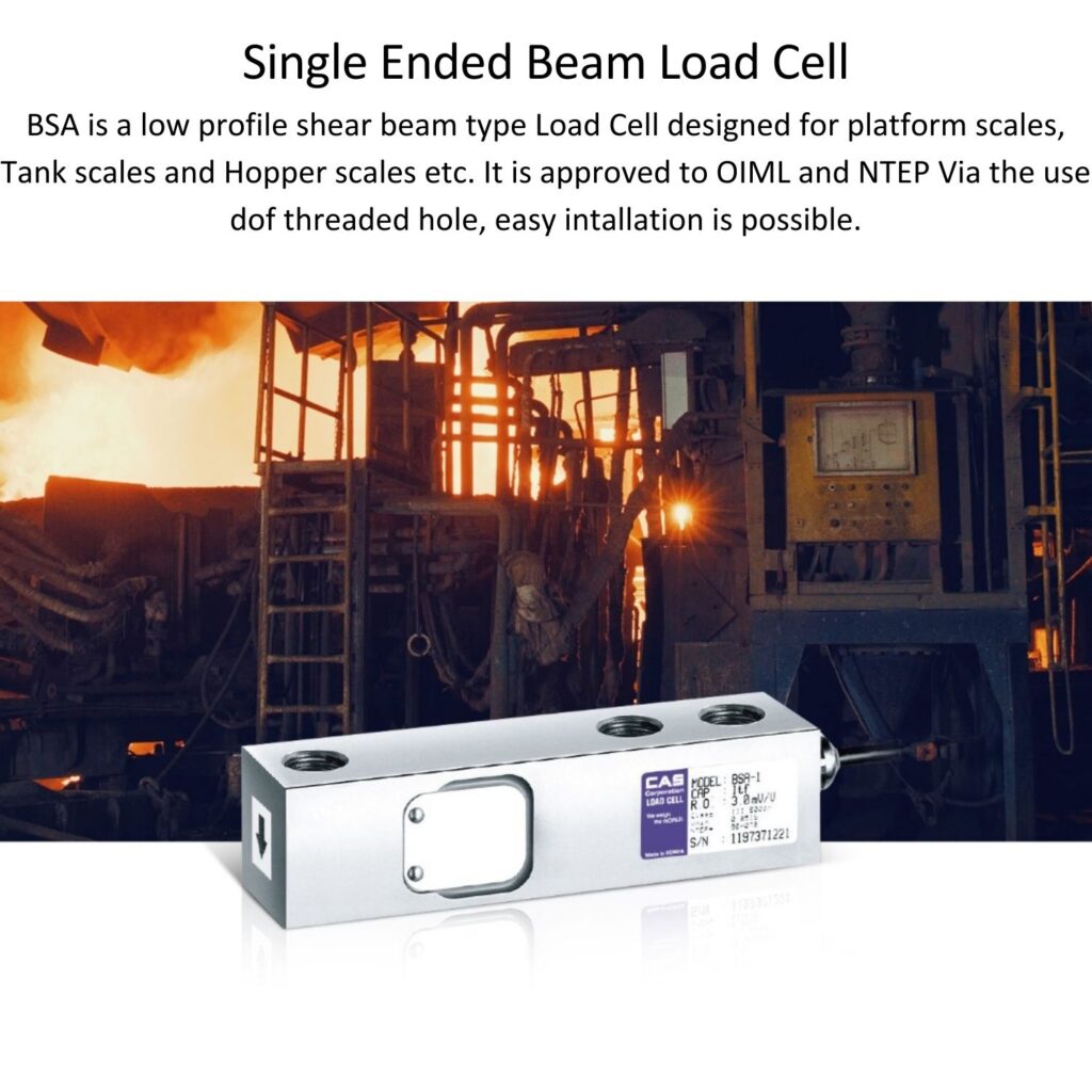 BSA is a single ended beam type load cell made of high-strength steel. Its low-profile, pressure-type structure makes it compatible with platform, hopper, tank scales, and a wide variety of other weighing systems.