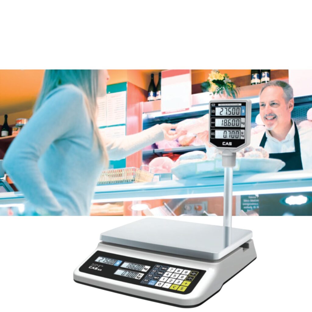 CAS PR-II electronic price computing scale offers high resolution up to 1/30,000 with a compact low-profile design, making it perfect for butcher shops, grocery stores, and retail weighing applications.